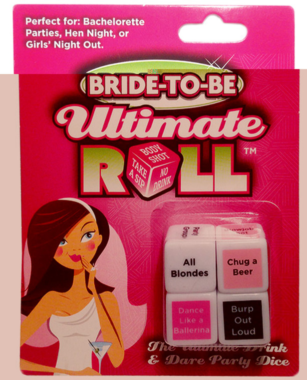 Bride-to-Be Ultimate Roll Dice Game. Perfect for a Bachelorette Party or Girls Night Out. Roll the dice and performance the action on the dice. From Ball and Chain.