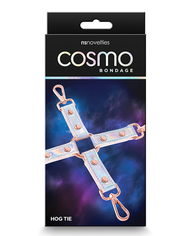 Light up the night with Cosmo's holographic hogtie. Accented with Rose Gold nickel free hardware and fully adjustable for universal fit. Made from easy to clean Vinyl.